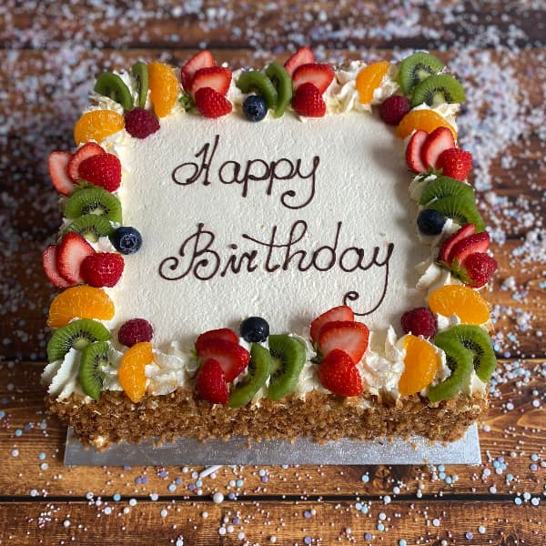 Introducing our Fresh Cream & Fruit Party Square Cake, the ideal choice for larger gatherings, birthdays, and celebrations. Made with three layers of soft vanilla sponge, this generous square cake is filled with whipped Irish cream and a hint of tangy fruit, then topped with more fresh cream and seasonal fruit for a beautiful and refreshing finish.